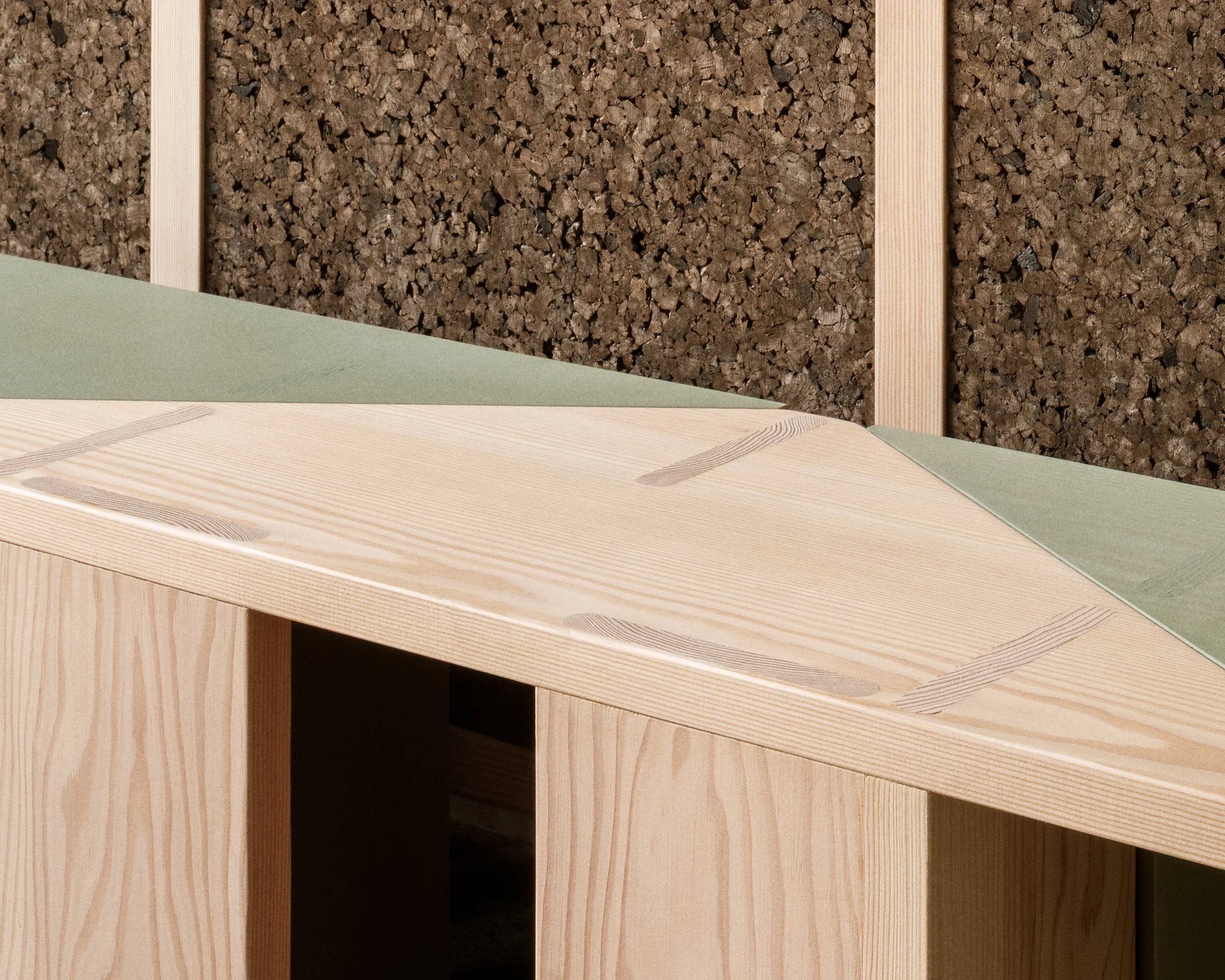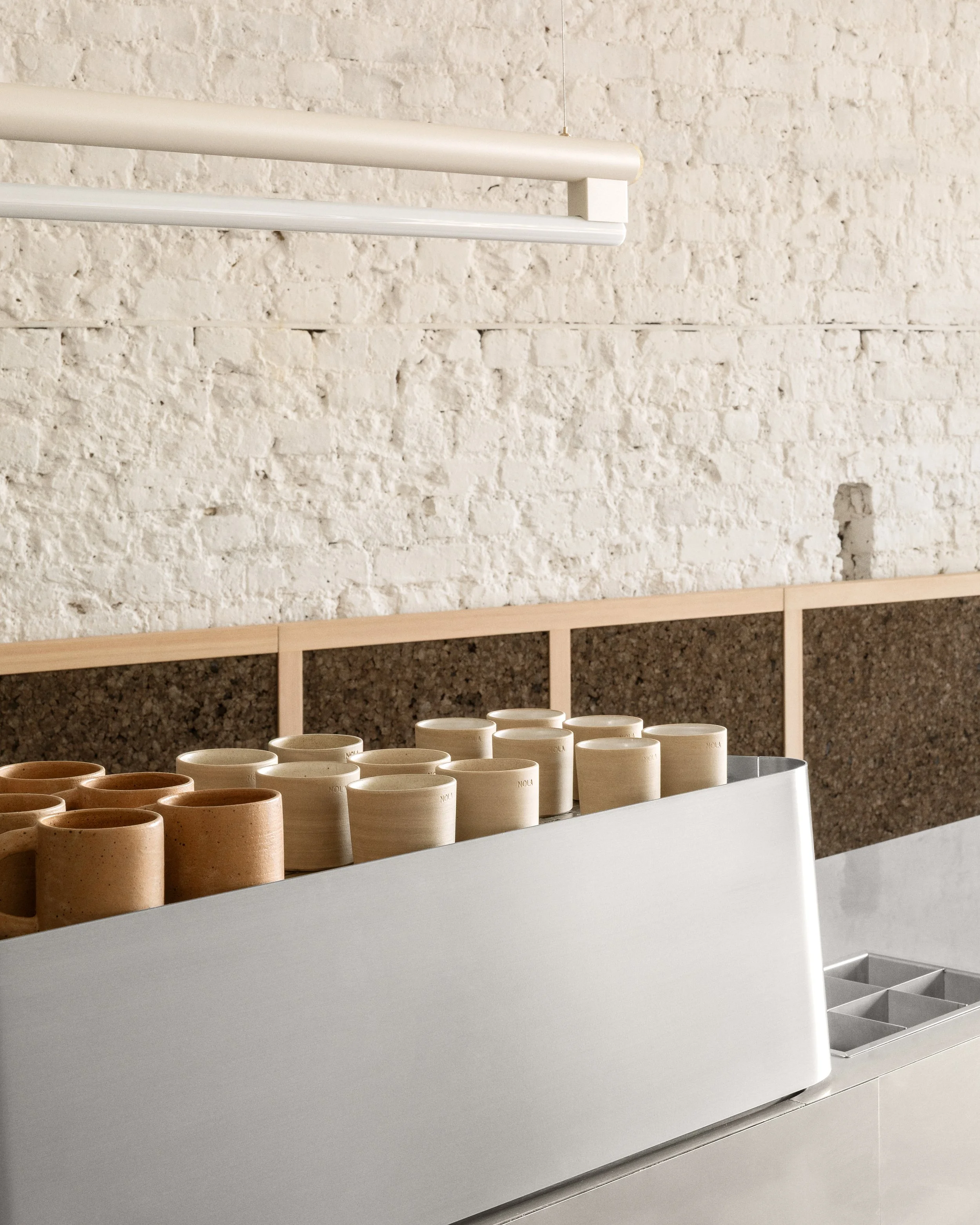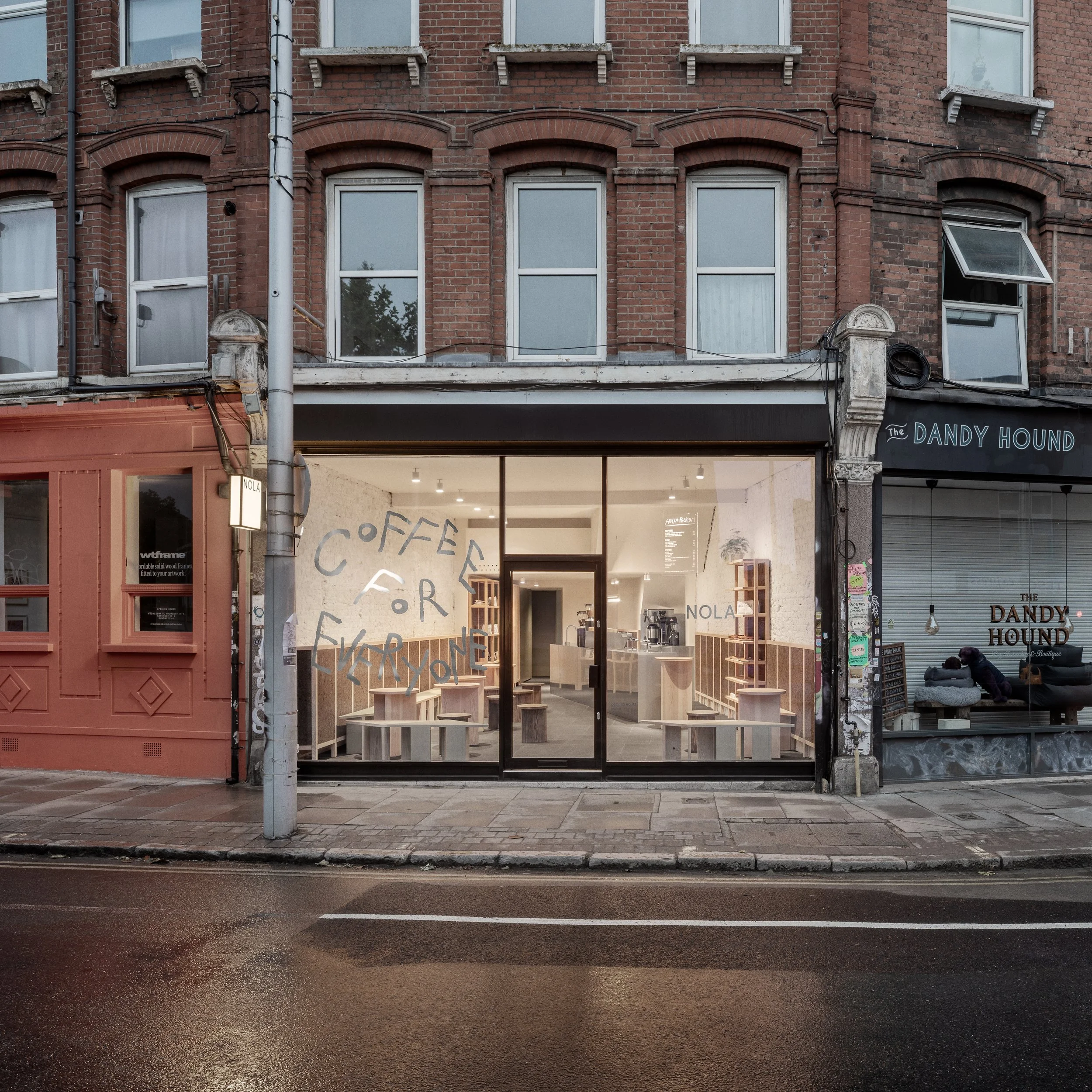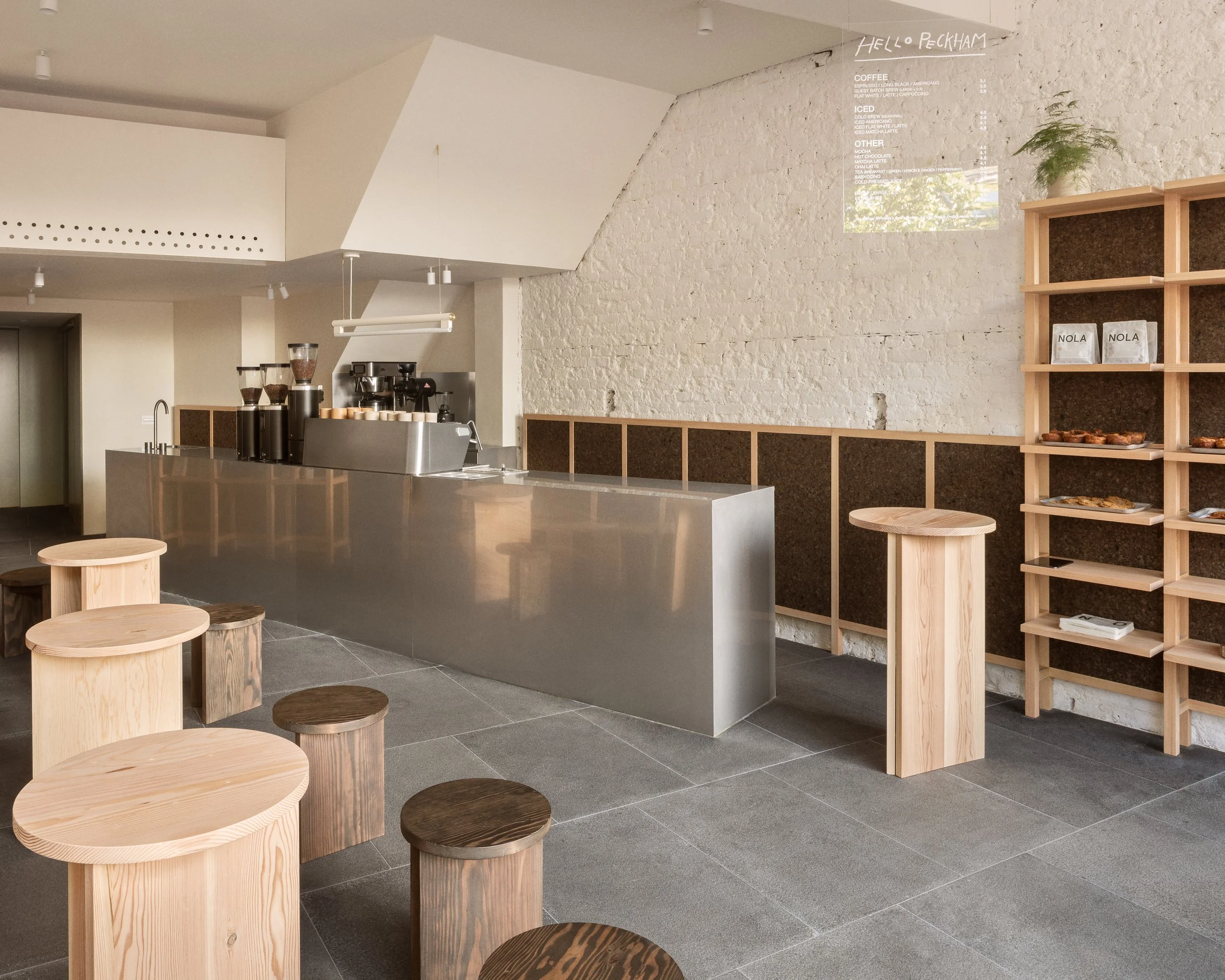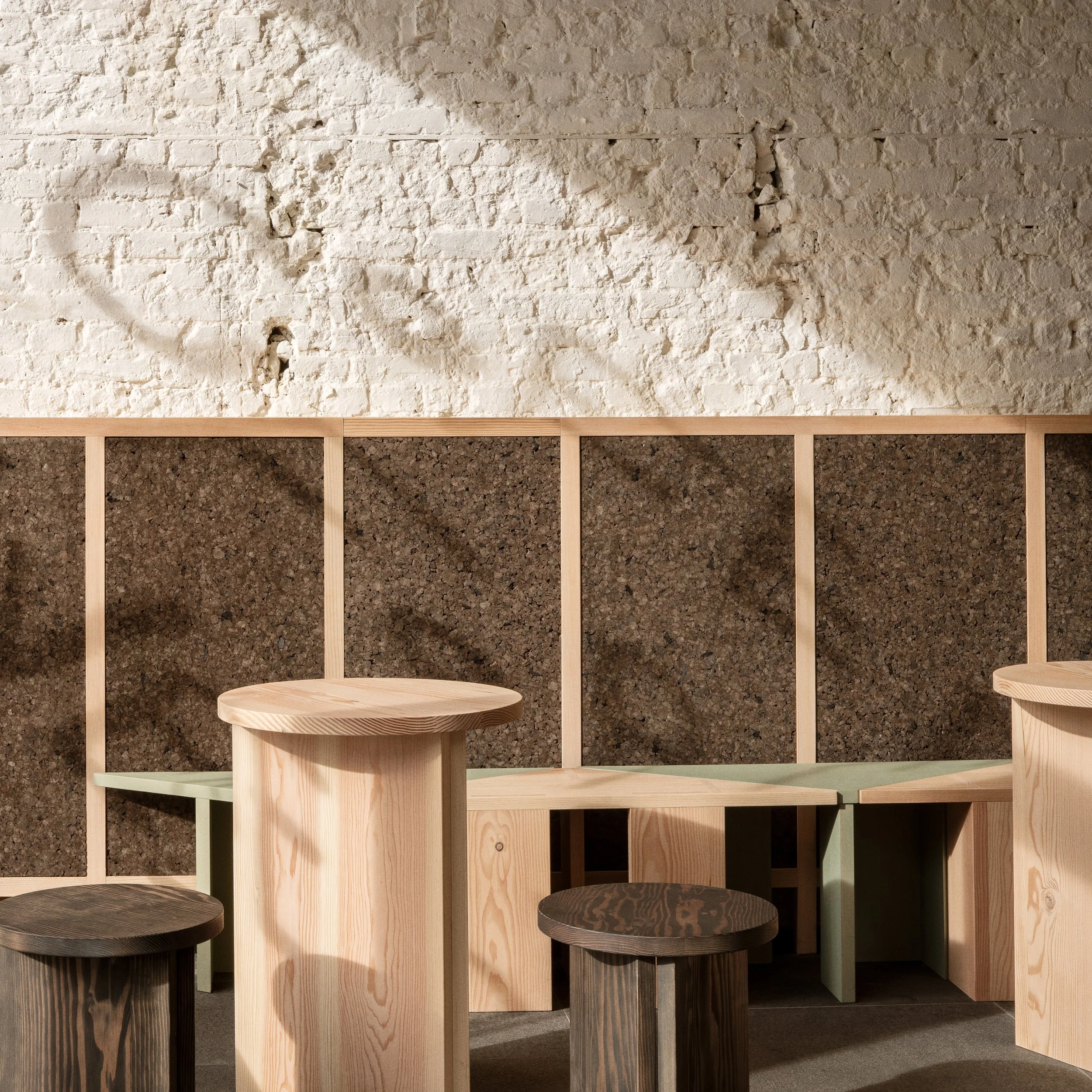 The modular, flexible furniture is designed using geometries of the letters N - magic snake-like perimeter benches that can be re-configured as required, O - for the circular tables and stools, L and A - supports that appear as tenon joints on top surfaces. The chosen materiality embraces resilience and at the same time reminisces of coffee. Key to this is the timber framed cork boards that line the perimeter walling of the space and jump up in areas to become shelving and act as store as well as display.