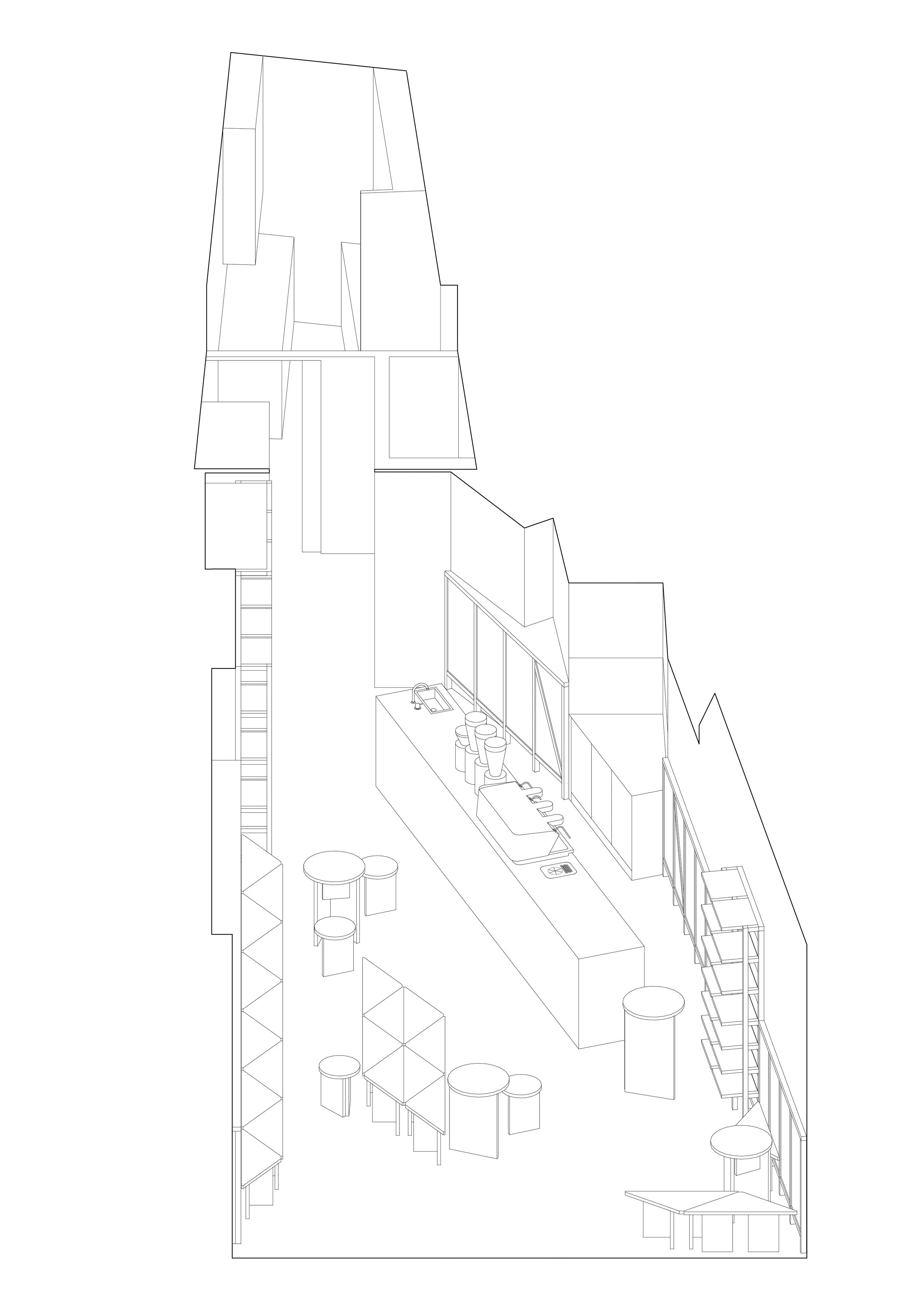 The concept of the new café is informed by both the ever changing, market-like atmosphere of the immediate surroundings of Peckham’s Rye Lane, as well as the intended use and layout of the space. The informal low seating close to the front with the taller elements of the bar and shelving further back reveals itself to passers-by, allowing the street in through the large, glazed shopfront.